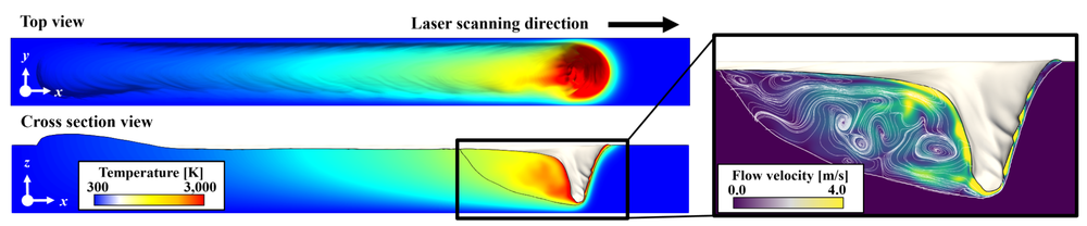 金属積層造形の粉末床溶融結合法を対象とした,溶融池熱流動計算の高精度・大規模シミュレーション手法の開発を行っています.