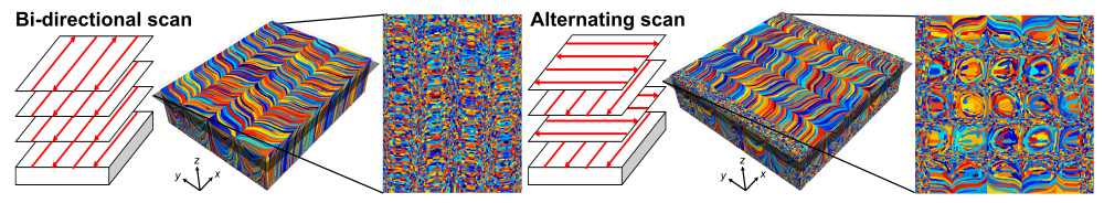 金属積層造形において,レーザー熱源の走査パス選択のスキャンストラテジーに依存した組織予測を高精度かつ大規模に実施可能なモデルと計算法の開発を行っています.