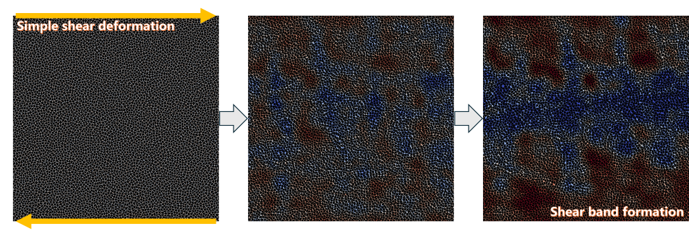 凝固中の合金は、凝固収縮、遠心力(遠心鋳造)、圧入(ダイカスト)、重力、圧延(連続鋳造)などによって外力を受けます。固液共存状態にある等軸粒が外力を受けると、固相率や粒形状に依存して固体間の相互作用が生じ、液体や固体とは異なる挙動を呈します。この中で、ダイラタンシーという現象は有名で、外力作用によって固体同士の相互作用が生じ、見た目の体積が増え、偏析帯や割れを引き起こします。このように固液共存域の変形は特異な挙動をするため、この現象をモデル化し、数値的に現象を解明する研究を行っています。