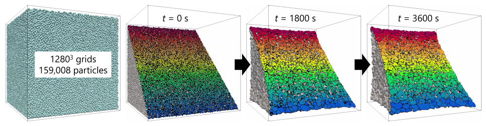 凝固組織は柱状晶と等軸晶に大別されます。等軸粒は液相中に孤立しているため、重力環境下では固液密度差によって液相内を運動します。この運動が偏析や割れなどの凝固欠陥を引き起こすため、等軸晶の形成過程の再現では固体の運動も表現する必要があります。本研究では、世界ではじめてphase-field法を用いて運動を伴う等軸デンドライト成長を安定に表現し、また、多結晶凝固問題へ拡張し、さらに、複数GPU並列計算で大規模化しました。
